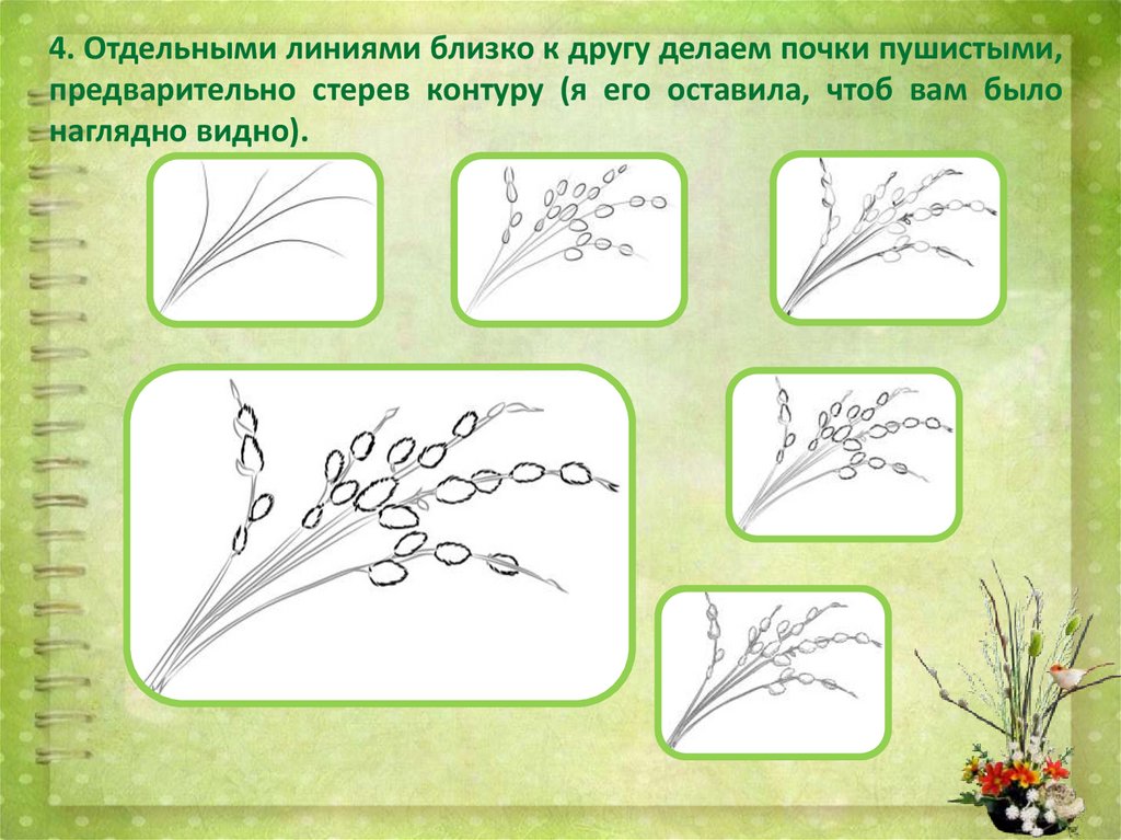 4. Отдельными линиями близко к другу делаем почки пушистыми,предварительно стерев контуру (я его оставила, чтоб вам было