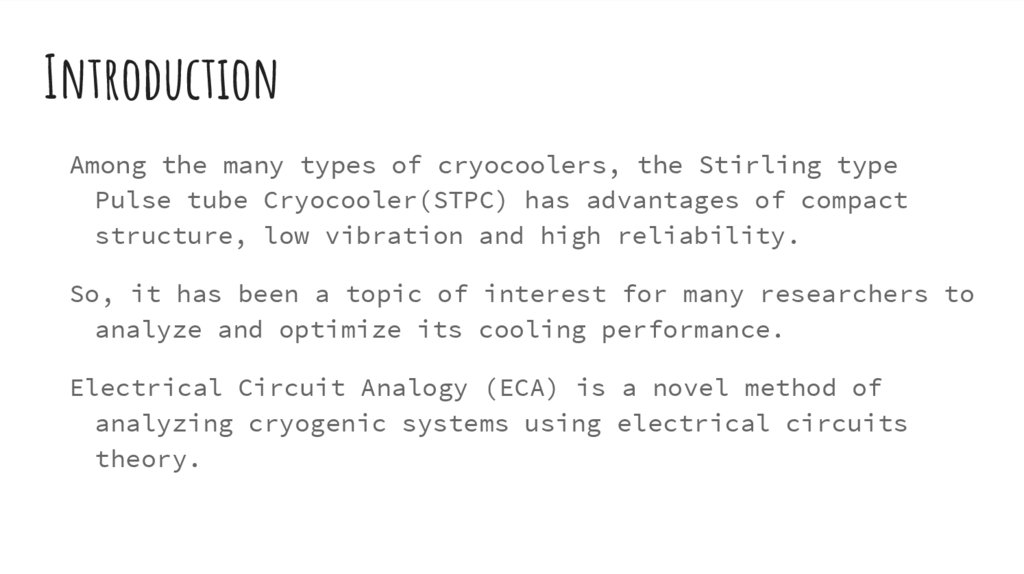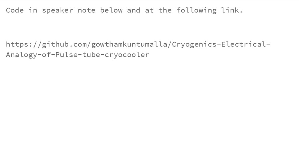 Code in speaker note below and at the following link.https://github.com/gowthamkuntumalla/Cryogenics-ElectricalAnalogy-of-Pulse-tube-cryocooler