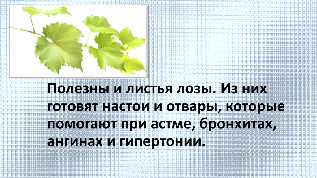 Полезны и листья лозы. Из нихготовят настои и отвары, которые