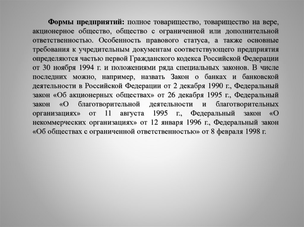 Формы предприятий: полное товарищество, товарищество на вере,акционерное общество, общество с ограниченной или дополнительной