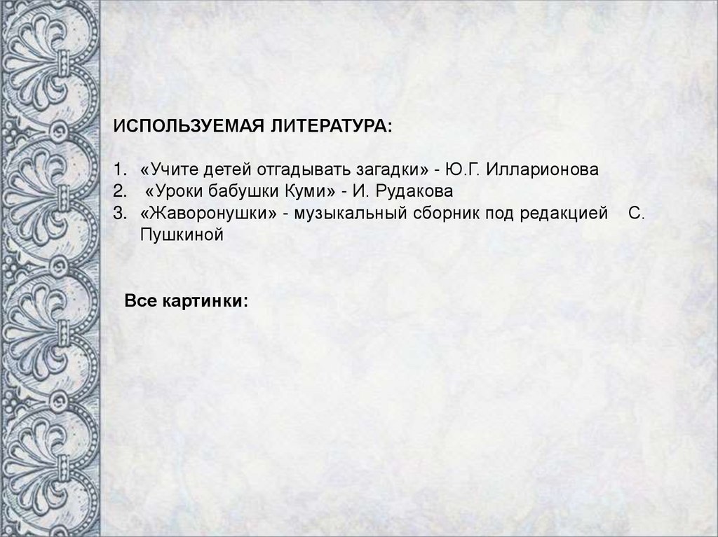 ИСПОЛЬЗУЕМАЯ ЛИТЕРАТУРА:1. «Учите детей отгадывать загадки» - Ю.Г. Илларионова