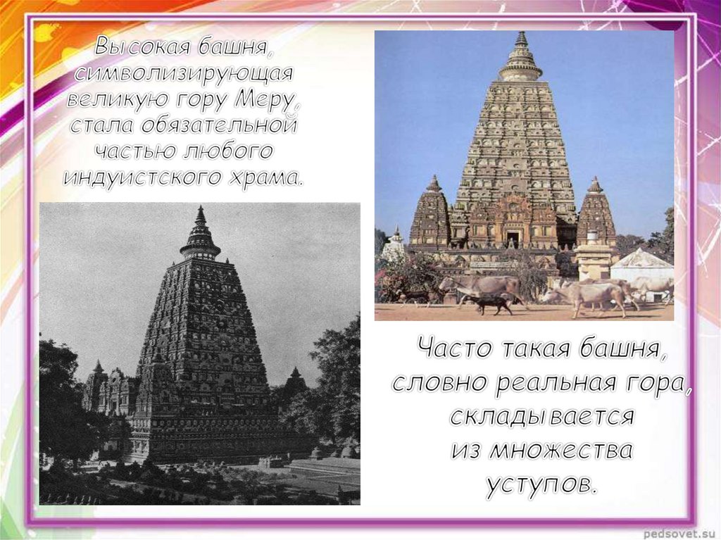4. Особенности архитектуры Древней Индии: величественные храмы строились по единому плану, описанному в религиозной литературе. Но