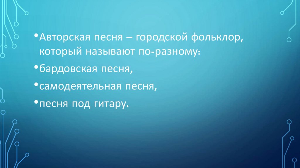 •Авторская песня – городской фольклор,который называют по-разному: