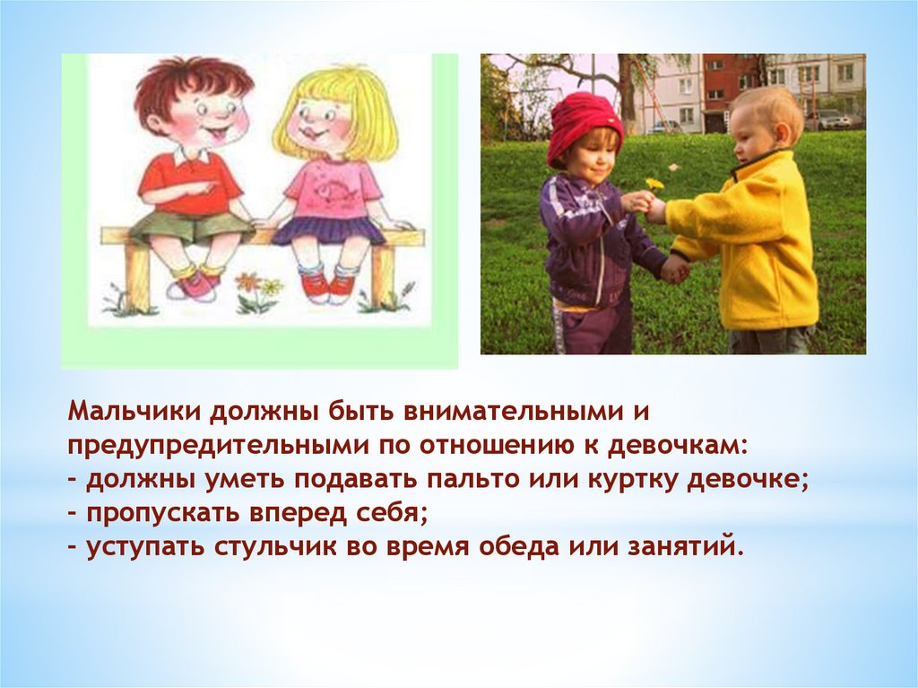 Мальчики должны быть внимательными ипредупредительными по отношению к девочкам: