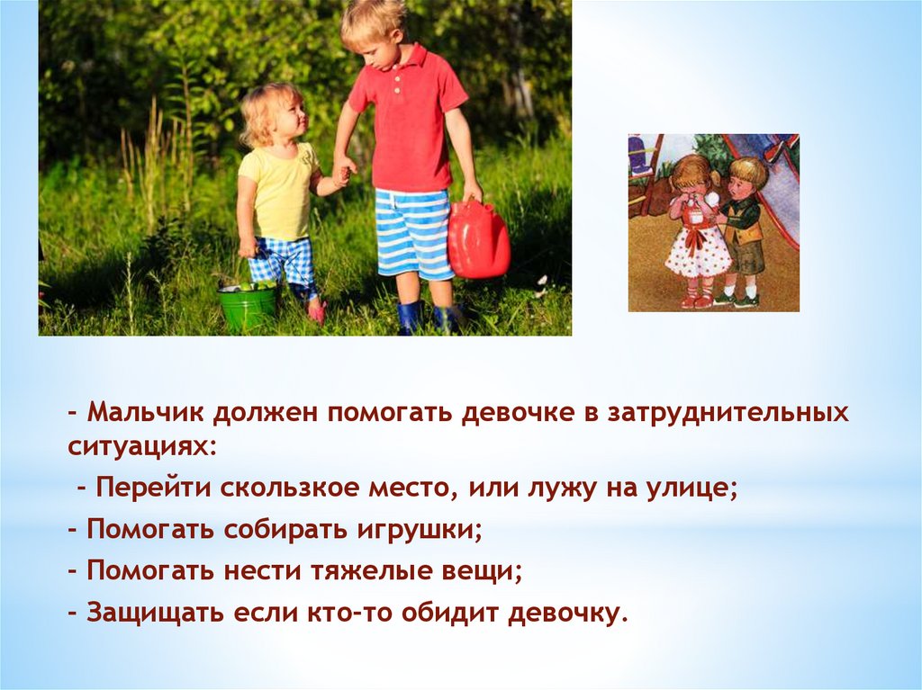 - Мальчик должен помогать девочке в затруднительныхситуациях: