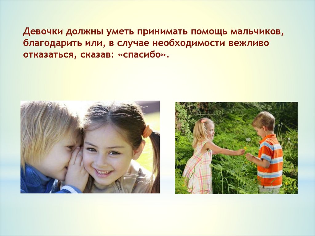 Девочки должны уметь принимать помощь мальчиков,благодарить или, в случае необходимости вежливо