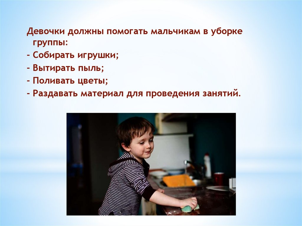 Девочки должны помогать мальчикам в уборкегруппы: