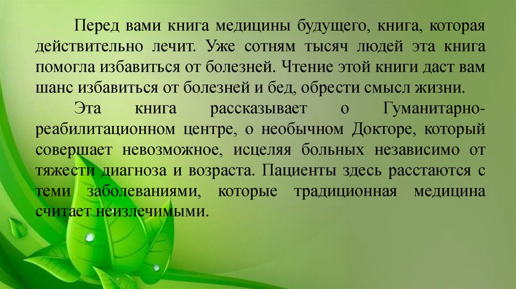 Перед вами книга медицины будущего, книга, котораядействительно лечит. Уже сотням тысяч людей эта книга