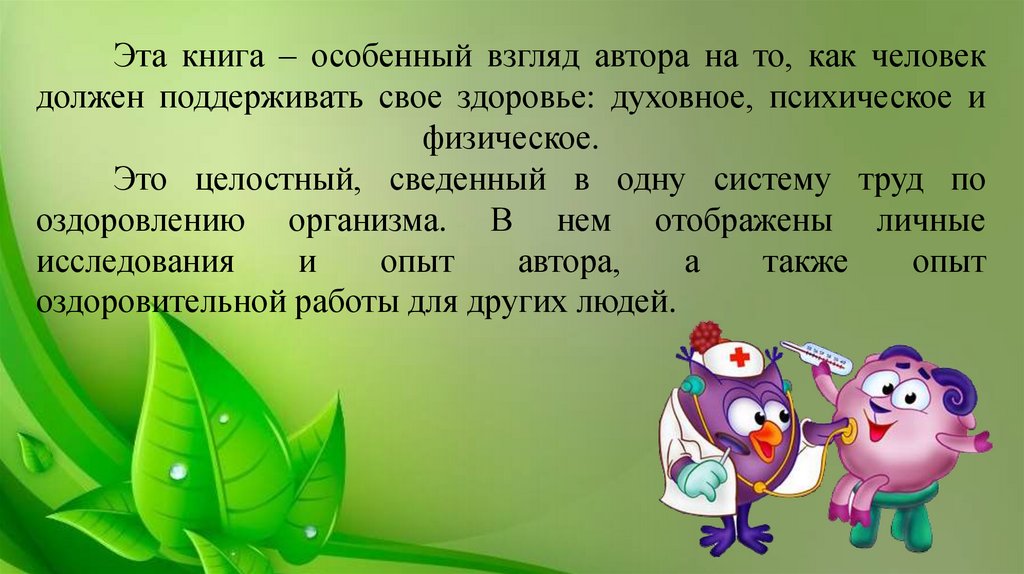 Эта книга – особенный взгляд автора на то, как человекдолжен поддерживать свое здоровье: духовное, психическое и