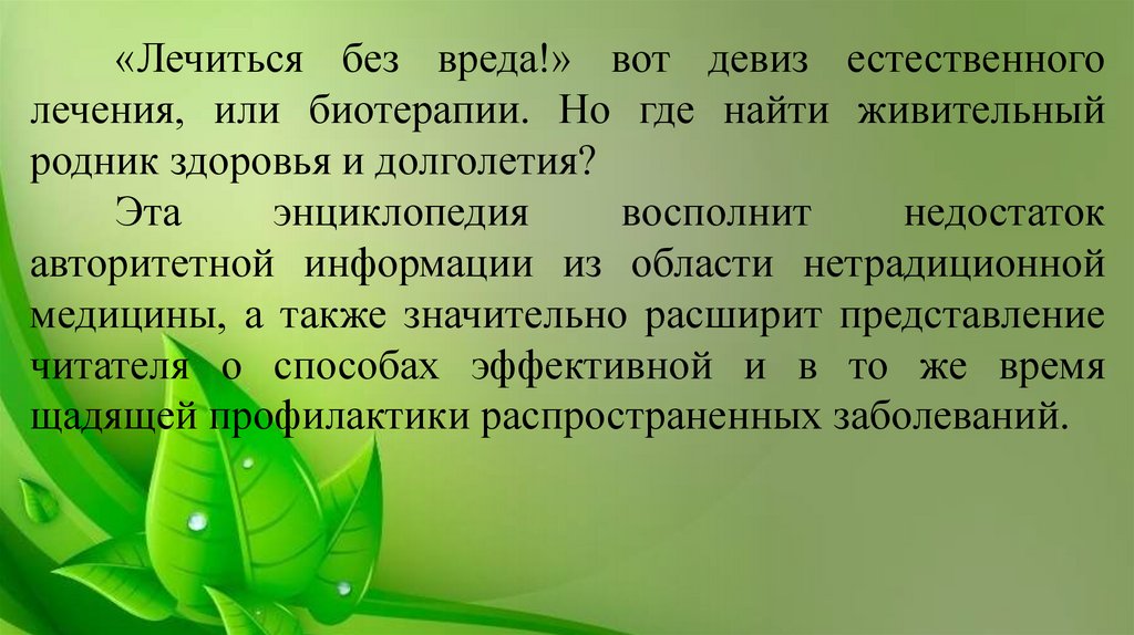 «Лечиться без вреда!» вот девиз естественноголечения, или биотерапии. Но где найти живительный