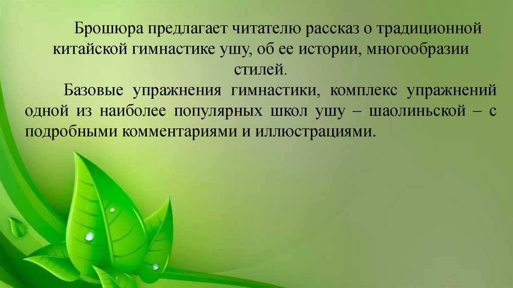 Брошюра предлагает читателю рассказ о традиционнойкитайской гимнастике ушу, об ее истории, многообразии