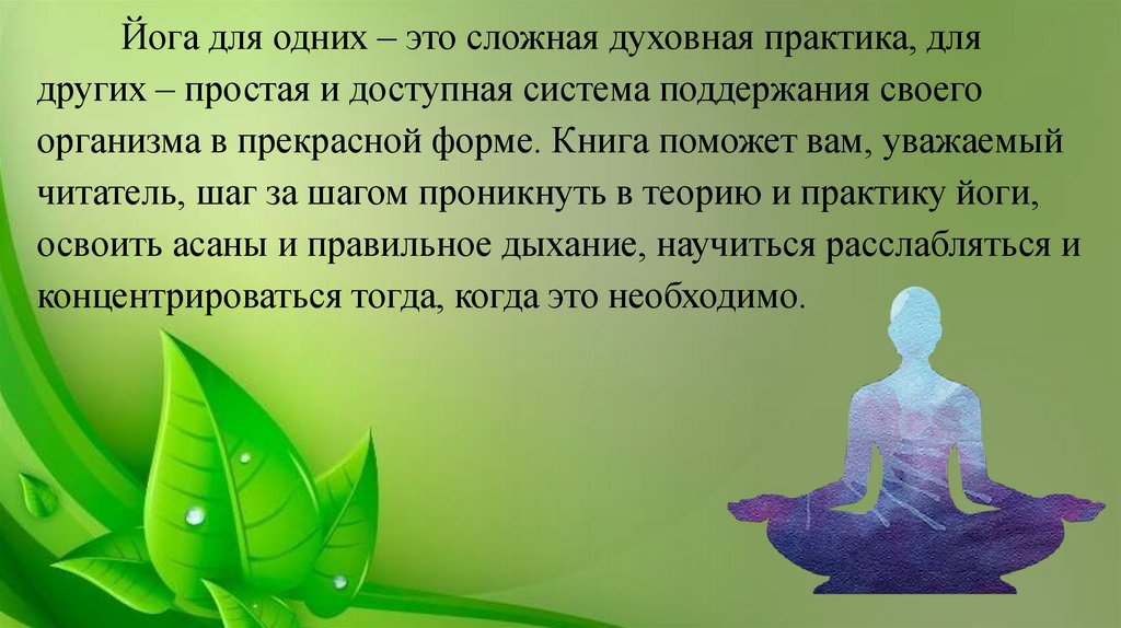 Йога для одних – это сложная духовная практика, длядругих – простая и доступная система поддержания своего