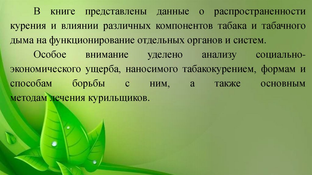 В книге представлены данные о распространенностикурения и влиянии различных компонентов табака и табачного