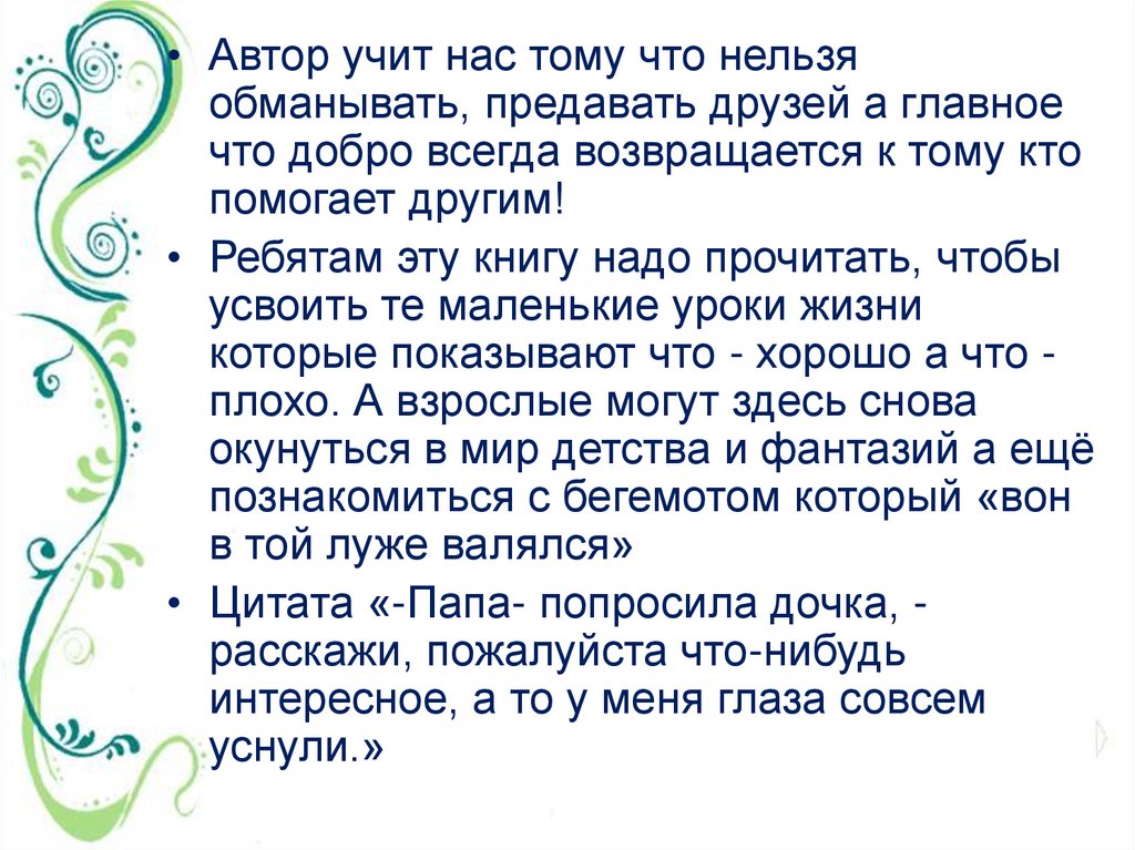 • Автор учит нас тому что нельзяобманывать, предавать друзей а главное