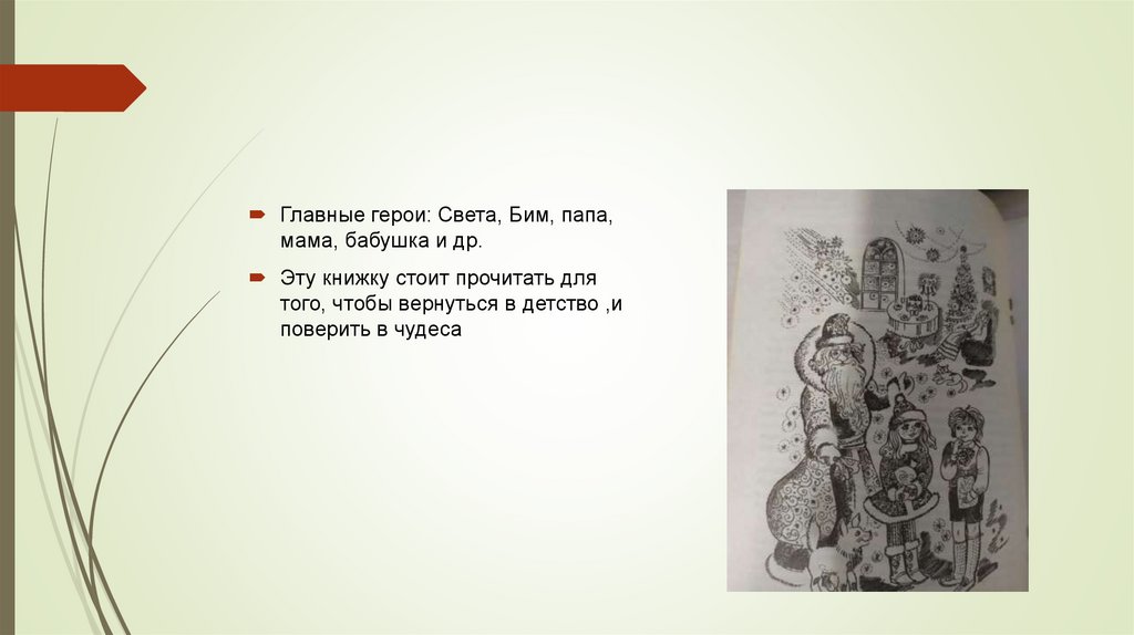 Главные герои: Света, Бим, папа,мама, бабушка и др.