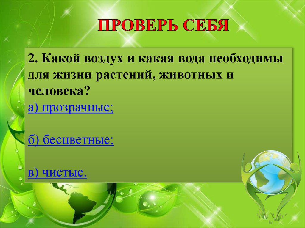 2. Какой воздух и какая вода необходимыдля жизни растений, животных и