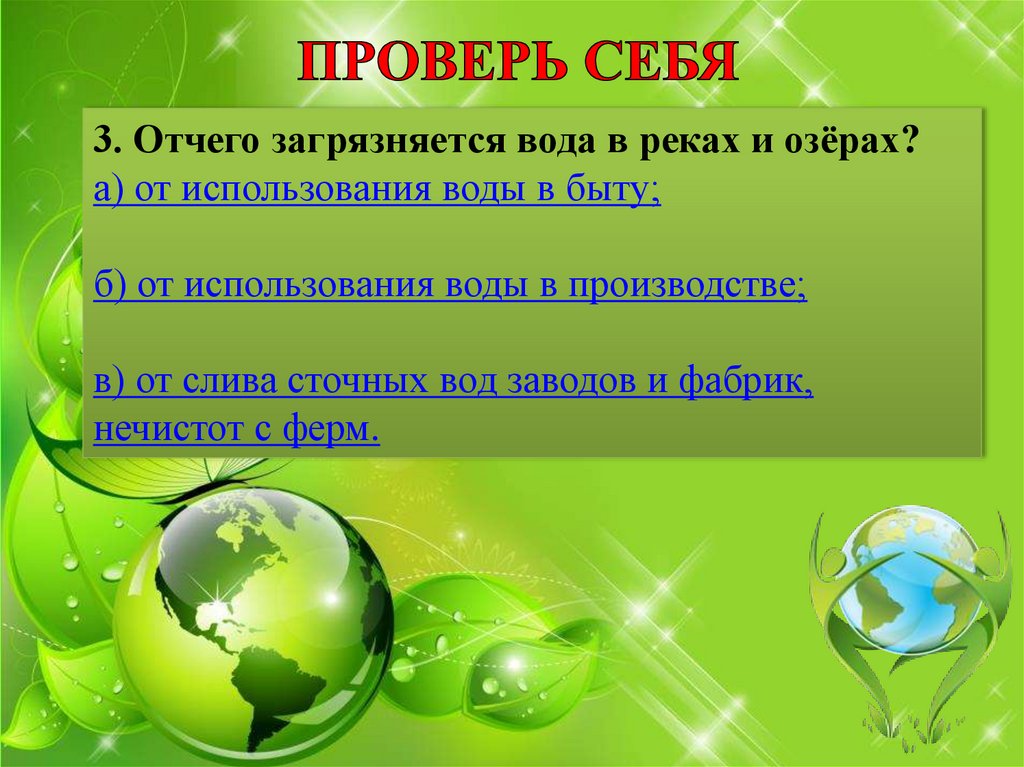 3. Отчего загрязняется вода в реках и озёрах?а) от использования воды в быту;