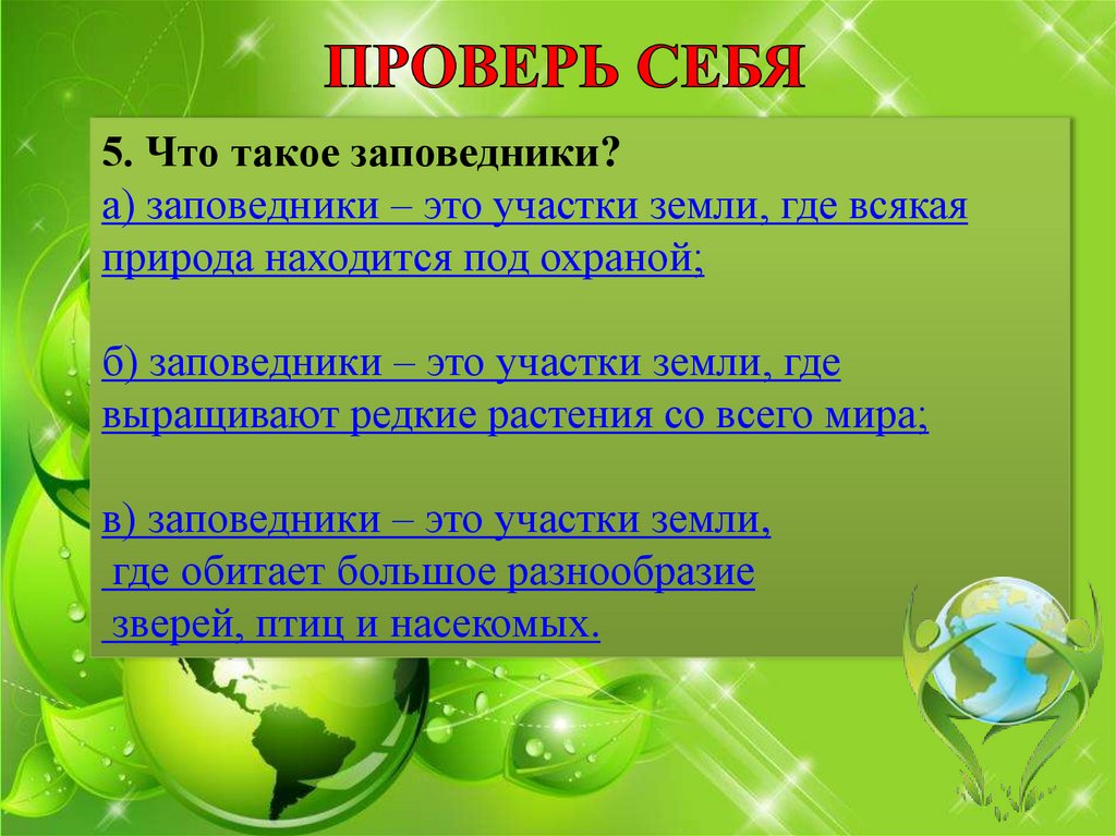 5. Что такое заповедники?а) заповедники – это участки земли, где всякая