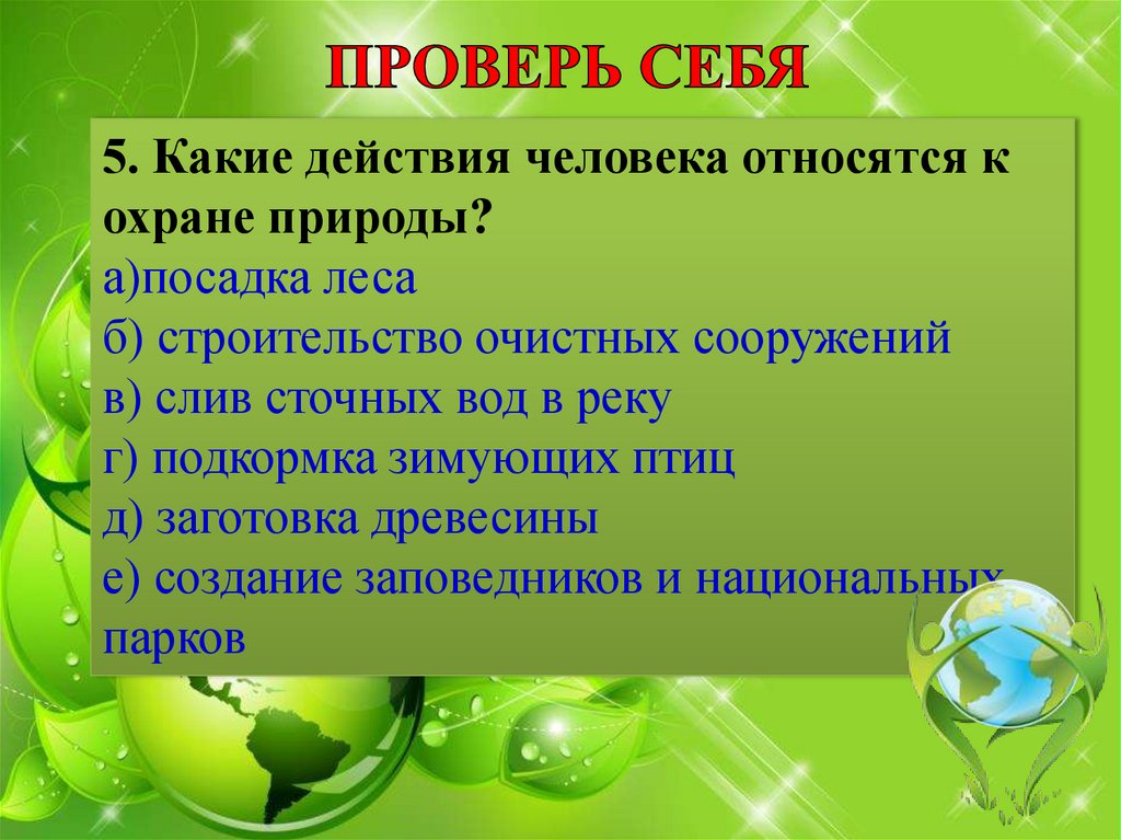 5. Какие действия человека относятся кохране природы?