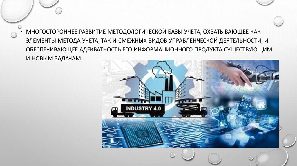 • МНОГОСТОРОННЕЕ РАЗВИТИЕ МЕТОДОЛОГИЧЕСКОЙ БАЗЫ УЧЕТА, ОХВАТЫВАЮЩЕЕ КАКЭЛЕМЕНТЫ МЕТОДА УЧЕТА, ТАК И СМЕЖНЫХ ВИДОВ УПРАВЛЕНЧЕСКОЙ ДЕЯТЕЛЬНОСТИ, И