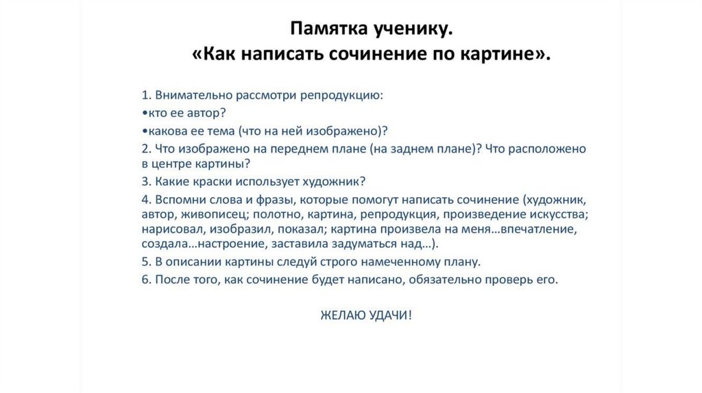 6. В твоём рассказе должно быть 3 части (три красные строки) : 1) Вступление (название картины, автор) 2) Описание картины (что на