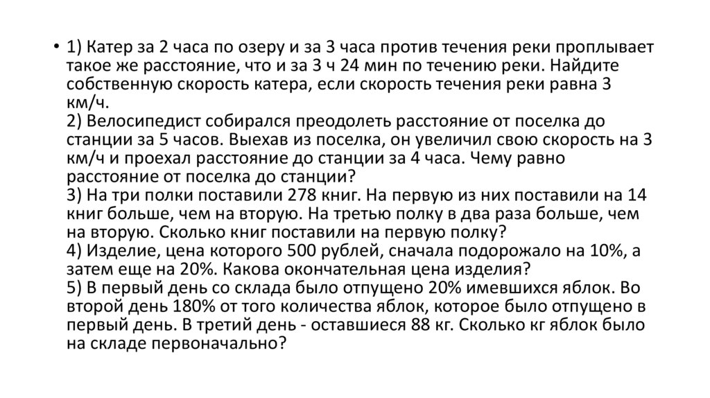 • 1) Катер за 2 часа по озеру и за 3 часа против течения реки проплываеттакое же расстояние, что и за 3 ч 24 мин по течению реки. Найдите