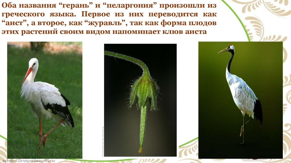 Оба названия “герань” и “пеларгония” произошли изгреческого языка. Первое из них переводится как