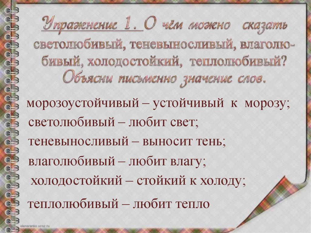 морозоустойчивый – устойчивый к морозу;светолюбивый – любит свет;