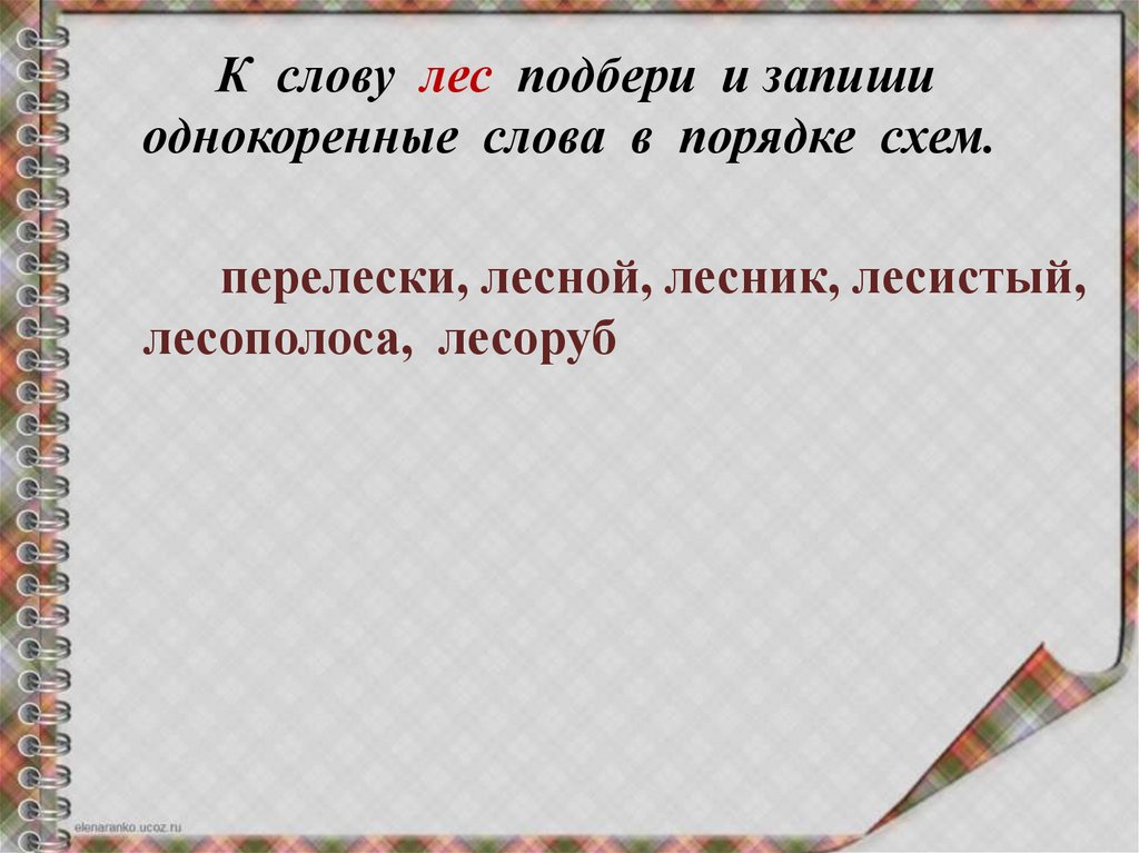 К слову лес подбери и запишиоднокоренные слова в порядке схем.