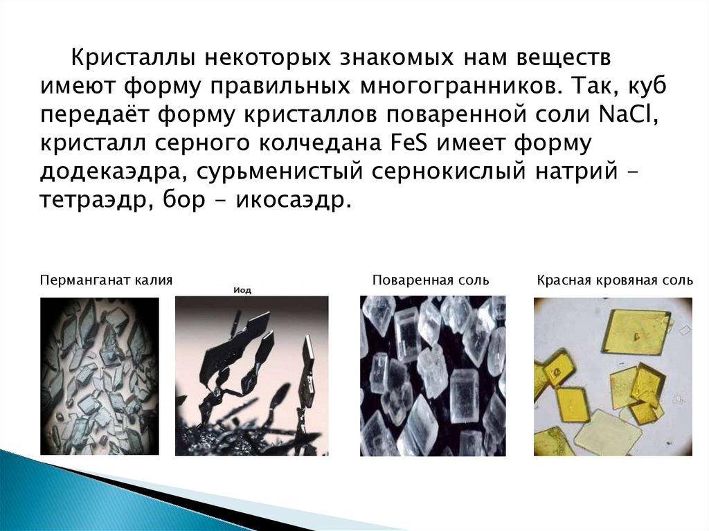 Кристаллы некоторых знакомых нам веществимеют форму правильных многогранников. Так, куб