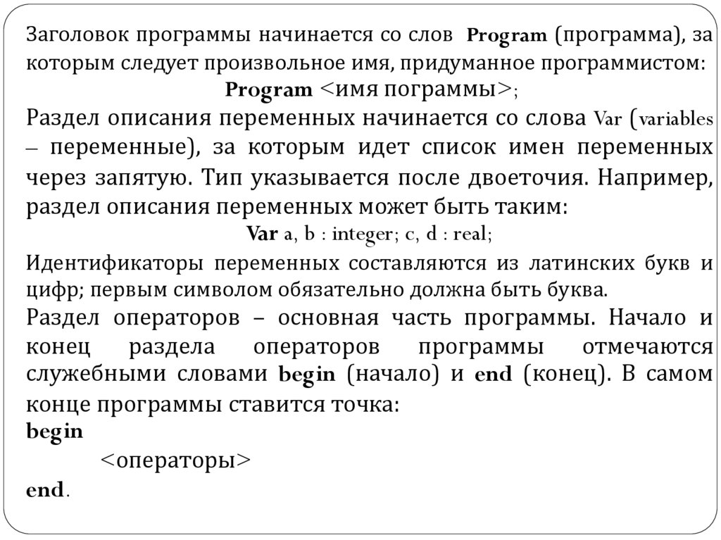 Заголовок программы начинается со слов Program (программа), закоторым следует произвольное имя, придуманное программистом: