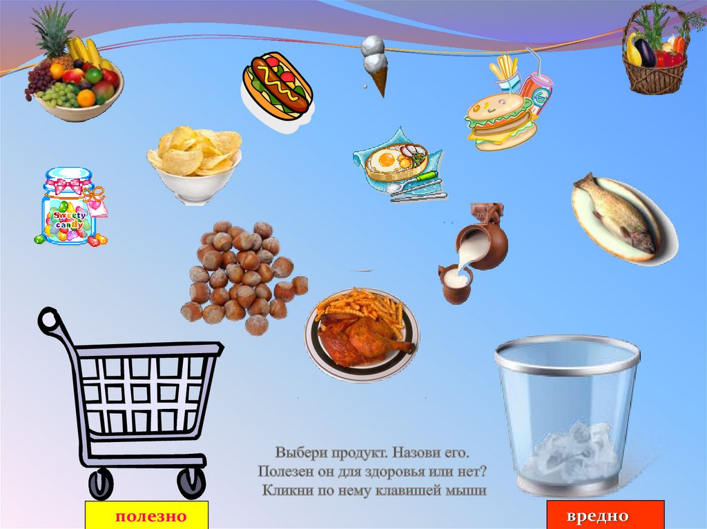 2. Игра «Полезные и вредные продукты» - соберем полезные для здоровья продукты в продуктовую тележку, а вредные в корзину