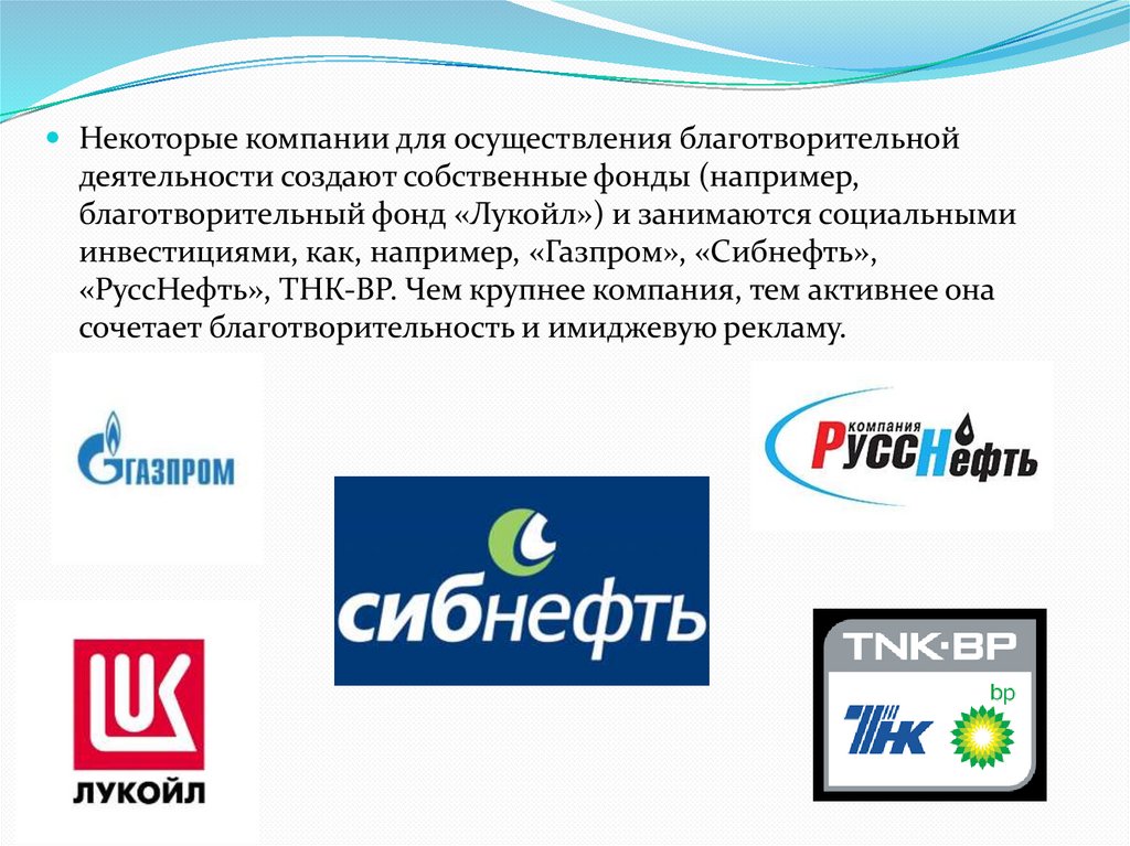 Некоторые компании для осуществления благотворительнойдеятельности создают собственные фонды (например,