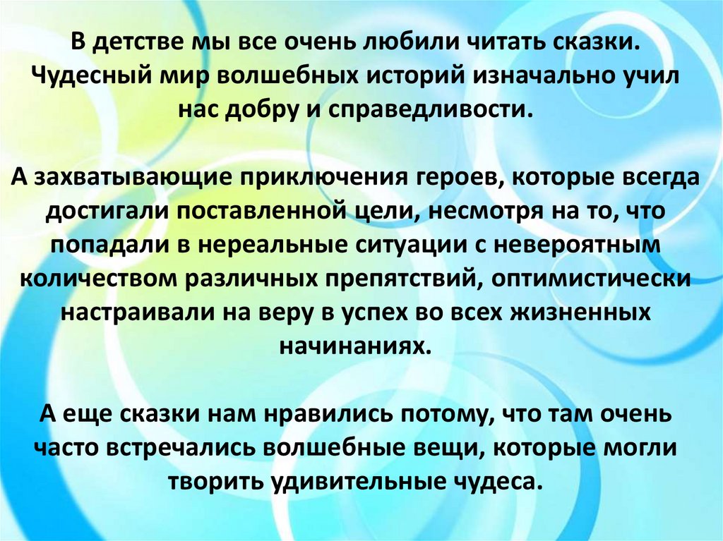 В детстве мы все очень любили читать сказки.Чудесный мир волшебных историй изначально учил
