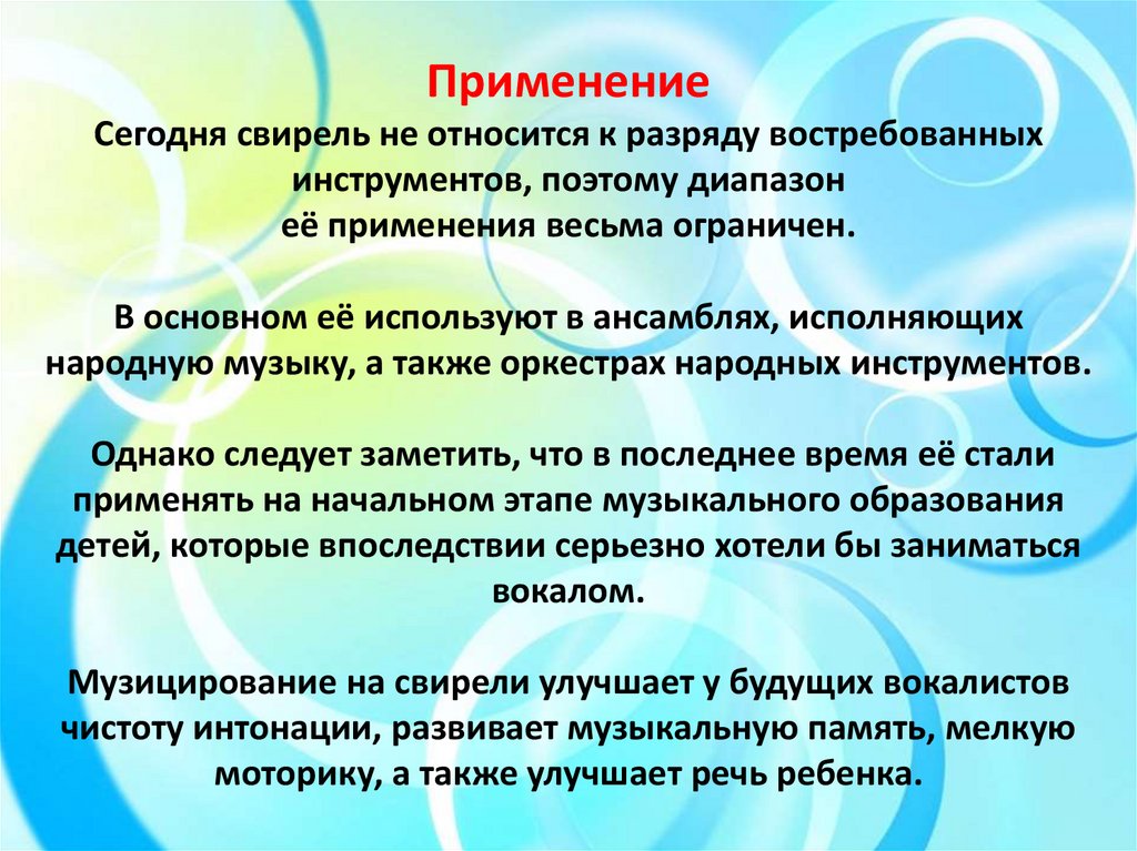ПрименениеСегодня свирель не относится к разряду востребованных