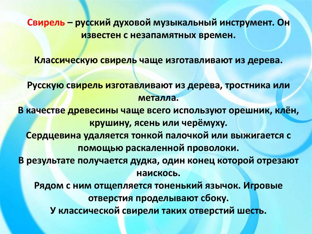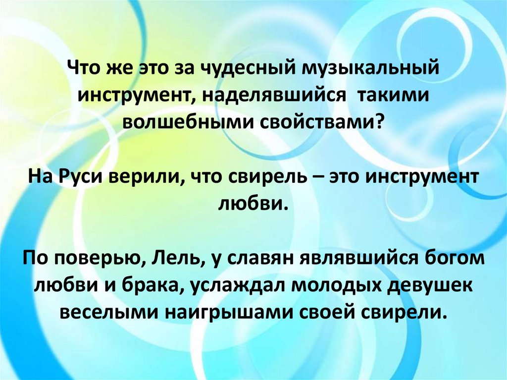 Свирель – русский духовой музыкальный инструмент. Онизвестен с незапамятных времен.