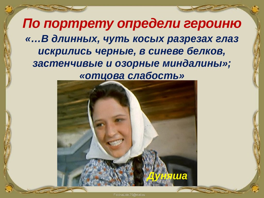 По портрету определи героиню«…В длинных, чуть косых разрезах глаз