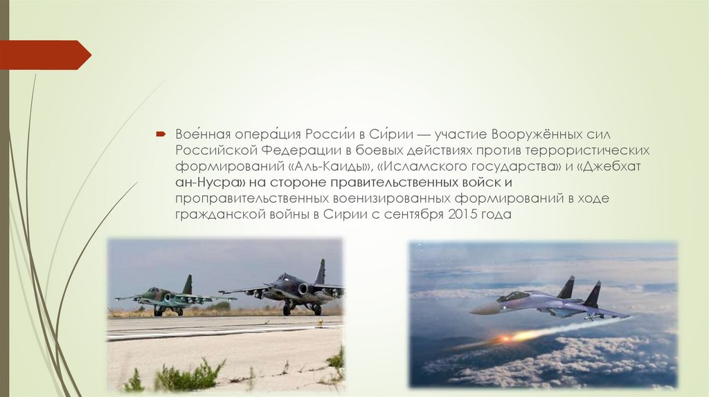 Вое́нная опера́ция Росси́и в Си́рии — участие Вооружённых силРоссийской Федерации в боевых действиях против террористических