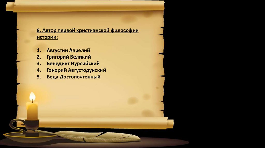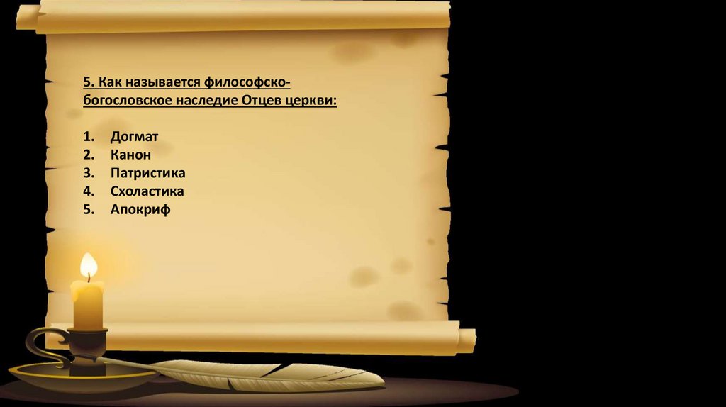 5. Как называется философскобогословское наследие Отцев церкви:1.