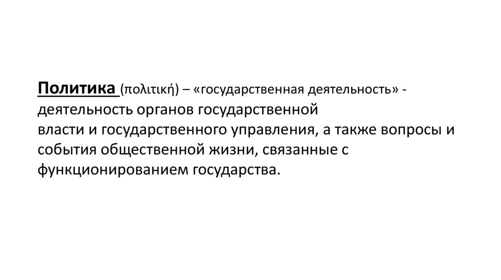 Политика (πολιτική) – «государственная деятельность» деятельность органов государственнойвласти и государственного управления, а также вопросы и