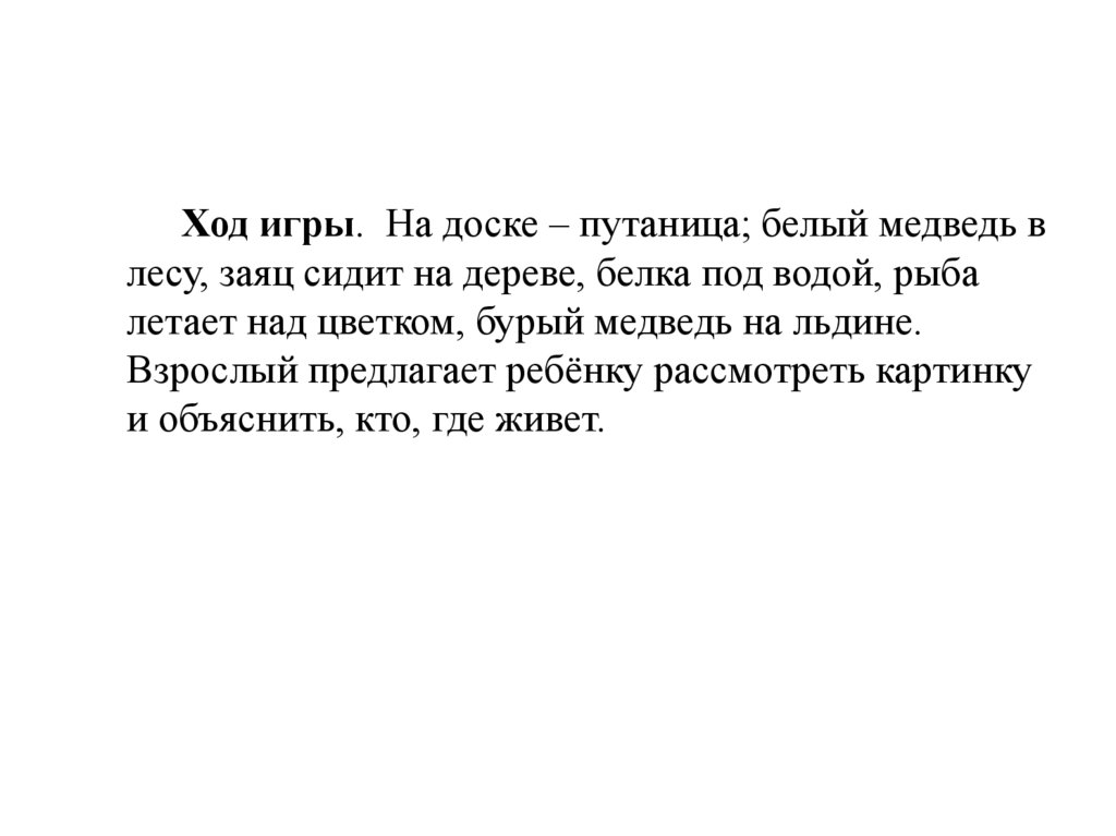 Ход игры. На доске – путаница; белый медведь влесу, заяц сидит на дереве, белка под водой, рыба