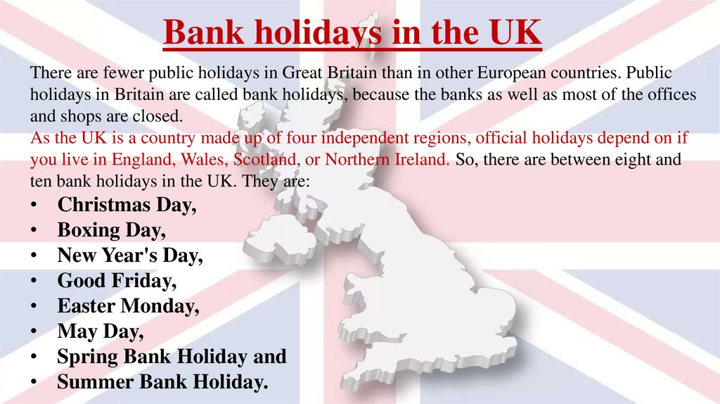 Bank holidays in the UKThere are fewer public holidays in Great Britain than in other European countries. Public