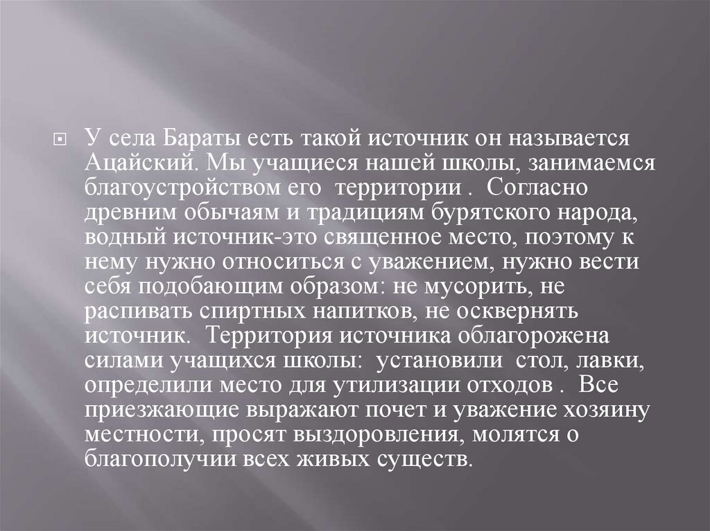 У села Бараты есть такой источник он называетсяАцайский. Мы учащиеся нашей школы, занимаемся