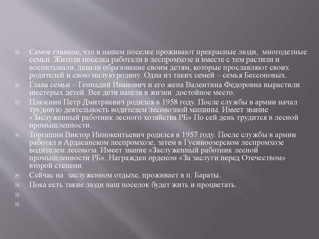 Самое главное, что в нашем поселке проживают прекрасные люди, многодетныесемьи. Жители поселка работали в леспромхозе и вместе с тем растили и