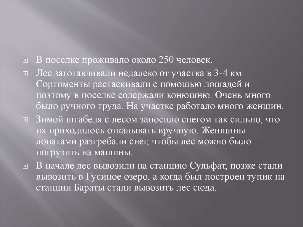 В поселке проживало около 250 человек.Лес заготавливали недалеко от участка в 3-4 км.