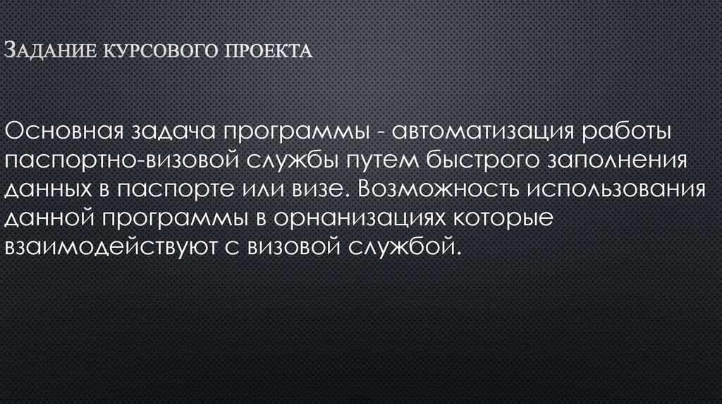 Основная задача программы - автоматизация работыпаспортно-визовой службы путем быстрого заполнения