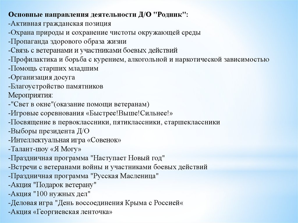 Основные направления деятельности Д/О "Родник":-Активная гражданская позиция