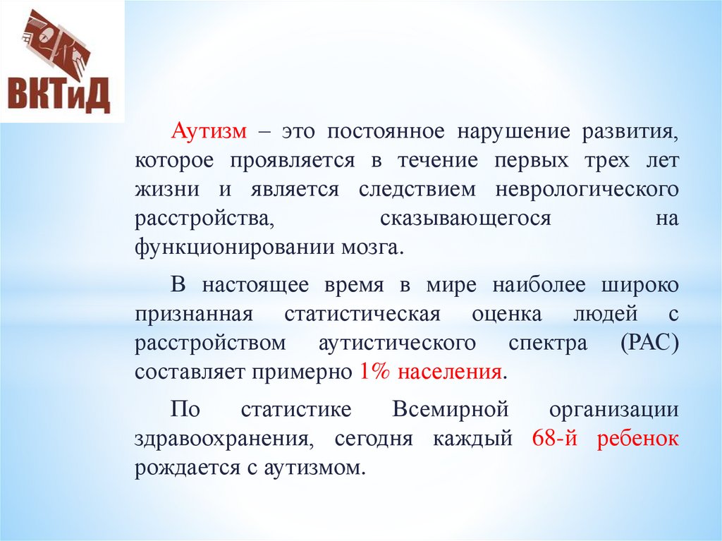 Аутизм – это постоянное нарушение развития,которое проявляется в течение первых трех лет