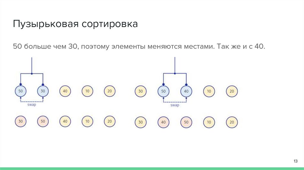 Пузырьковая сортировка50 больше чем 30, поэтому элементы меняются местами. Так же и с 40.