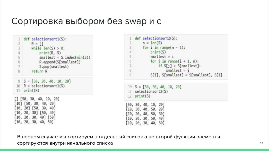 Сортировка выбором без swap и сВ первом случае мы сортируем в отдельный список а во второй функции элементы